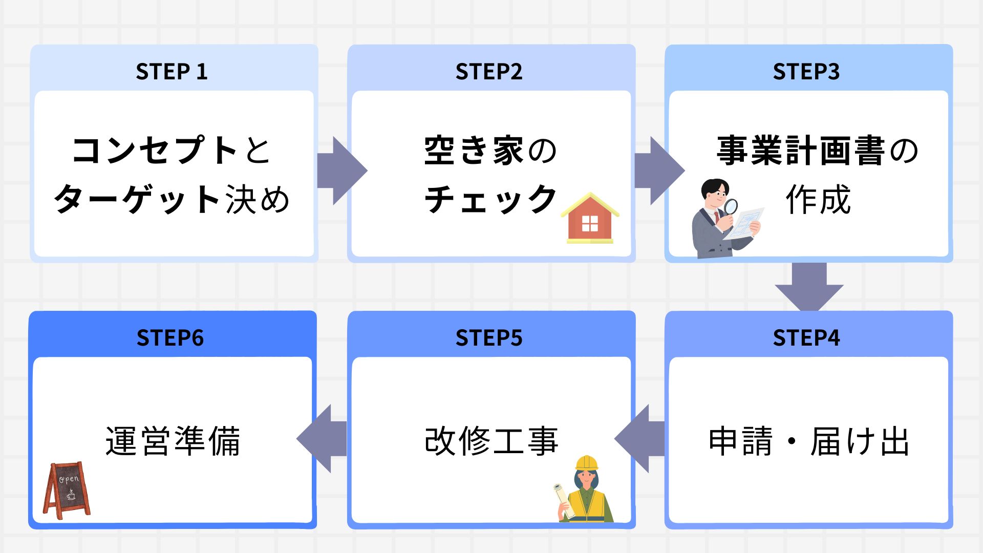 空き家カフェ開業にはさまざまなステップがありますが、Tu・Cu・Ruでは次のような部分を中心にサポートしています。
