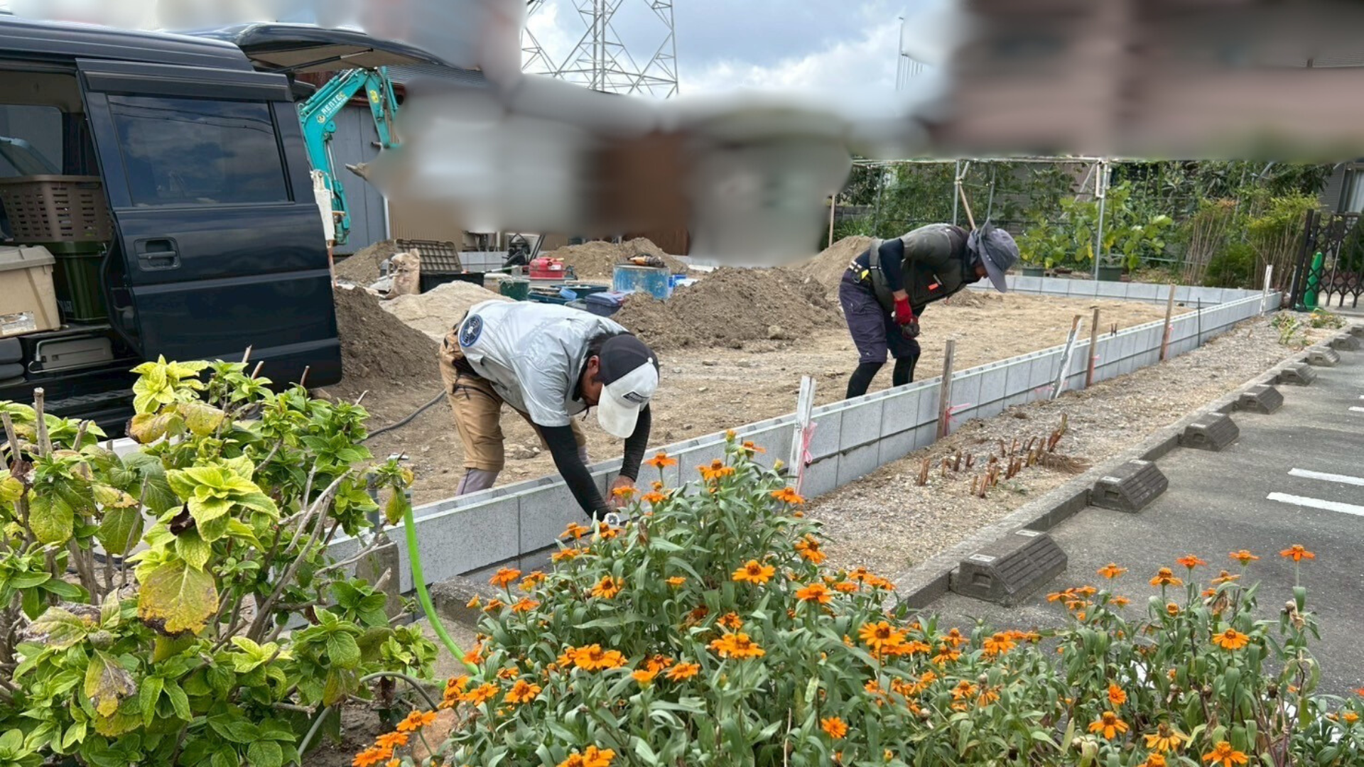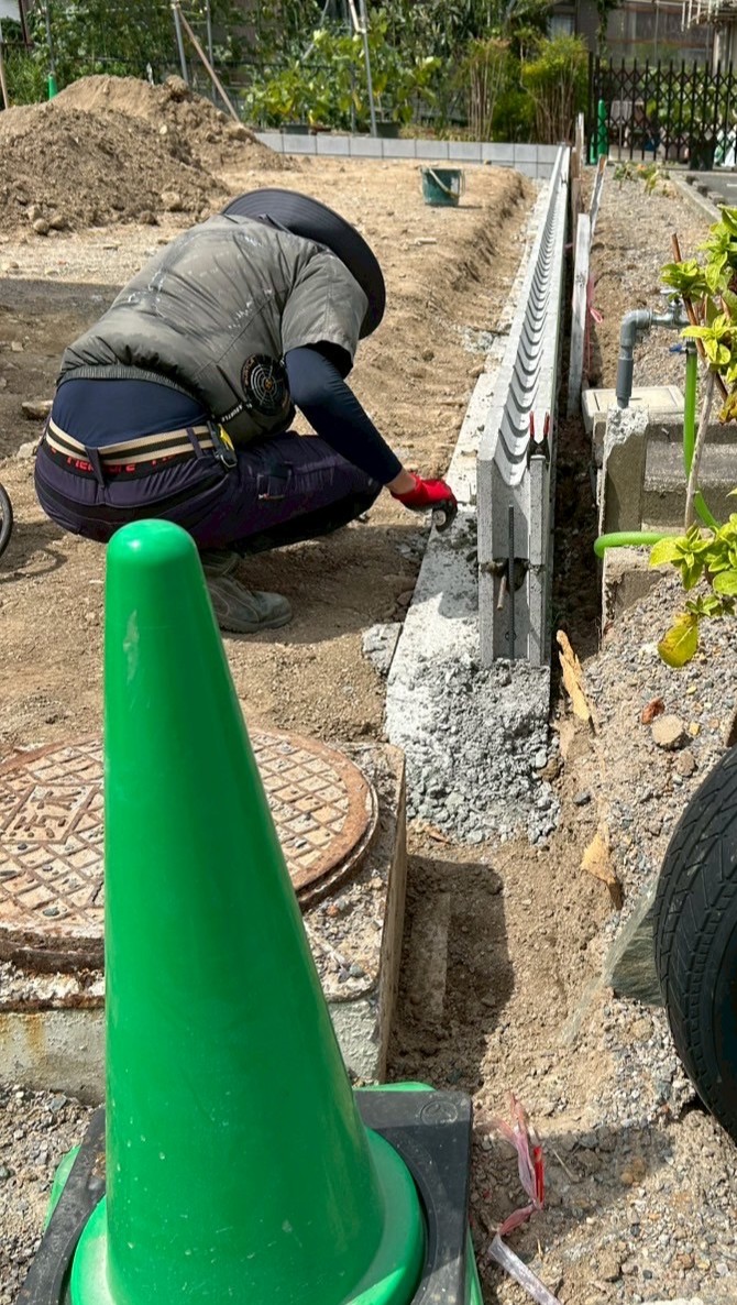 外構業者さんが、境界線となる部分にブロックの積み上げ作業を行います👀