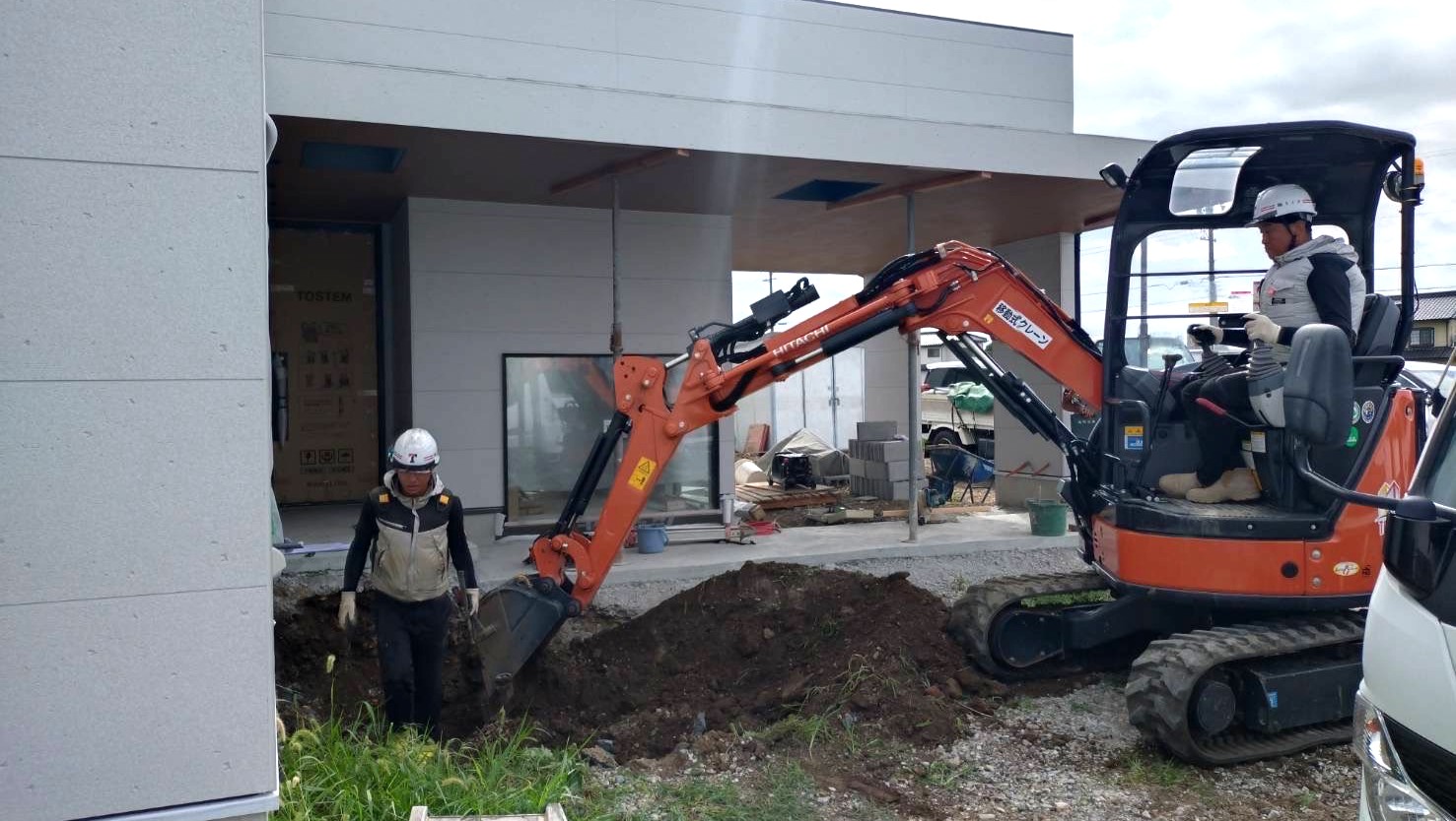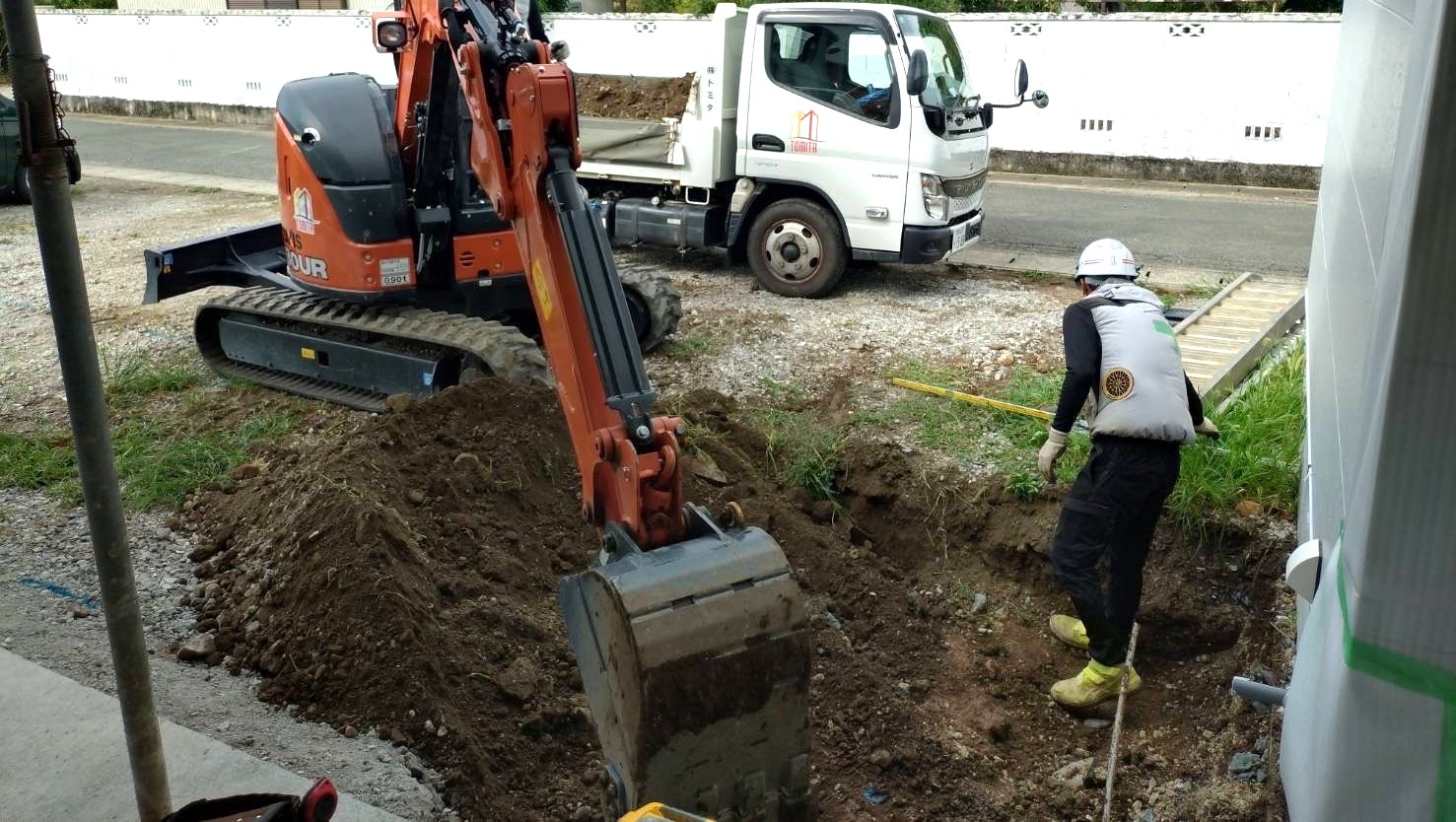 ショベルカーで擁壁用の基礎部分を掘削します。