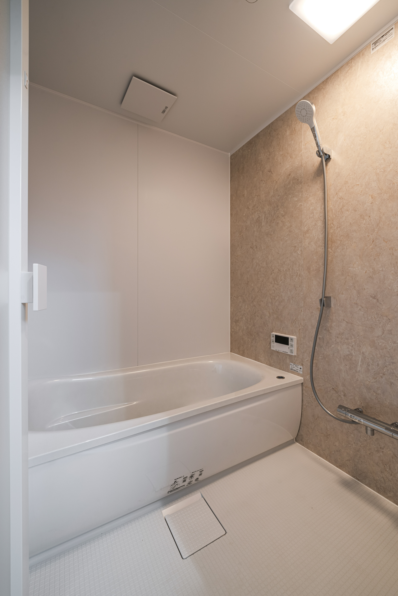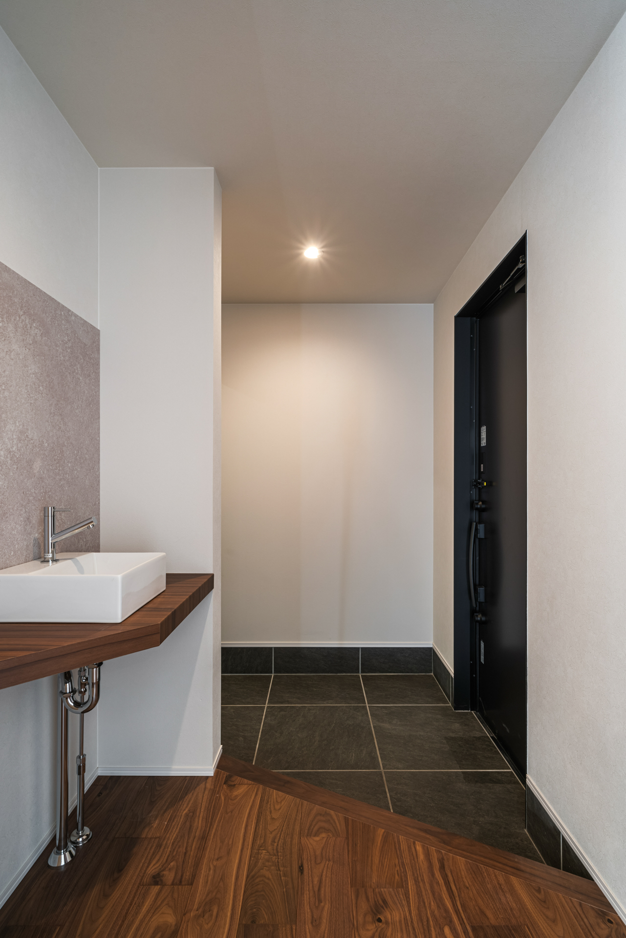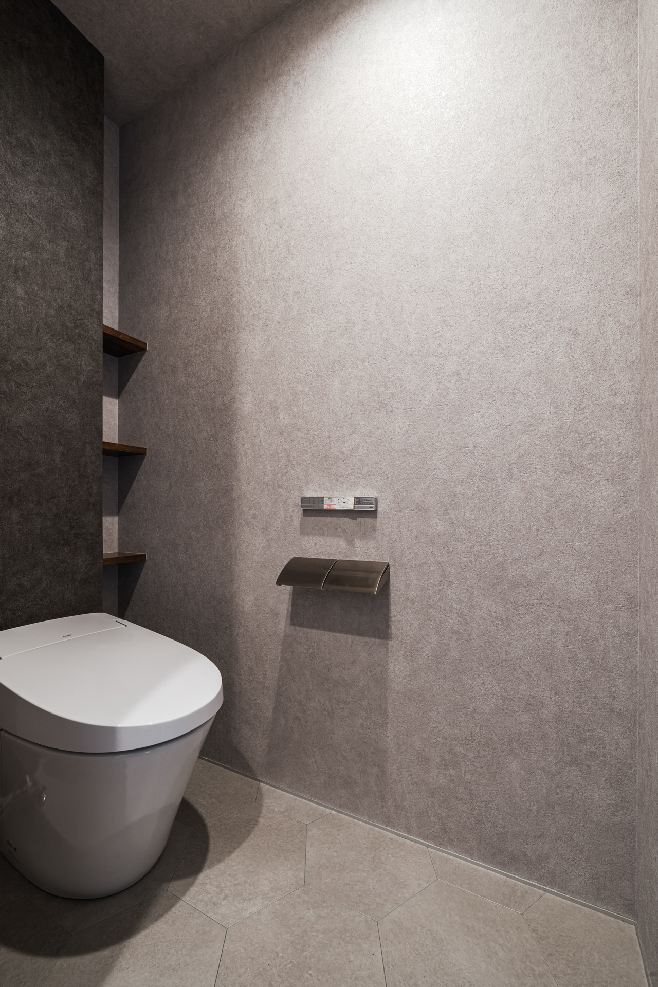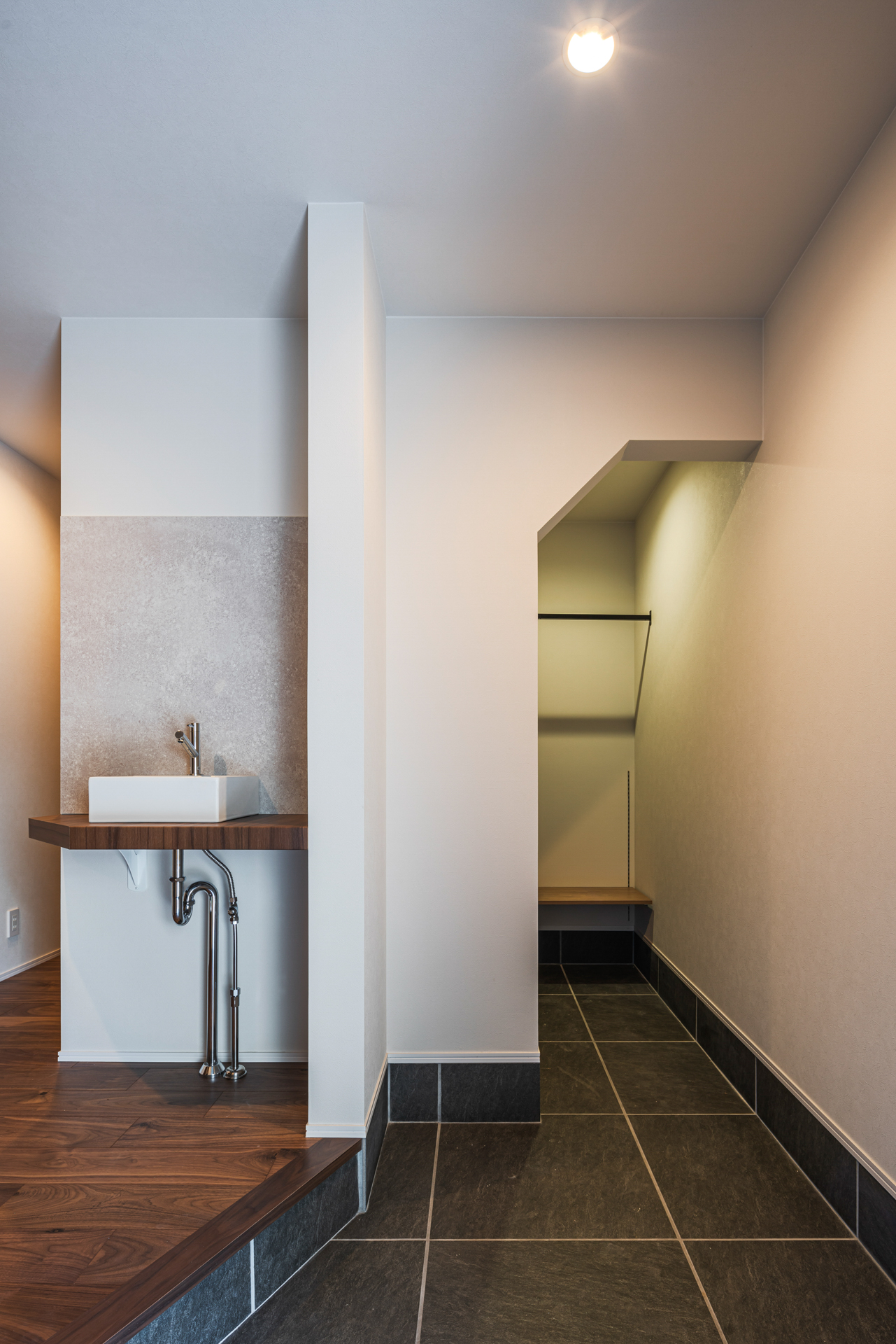 ヘキサゴンタイルの床、壁のニッチ収納、